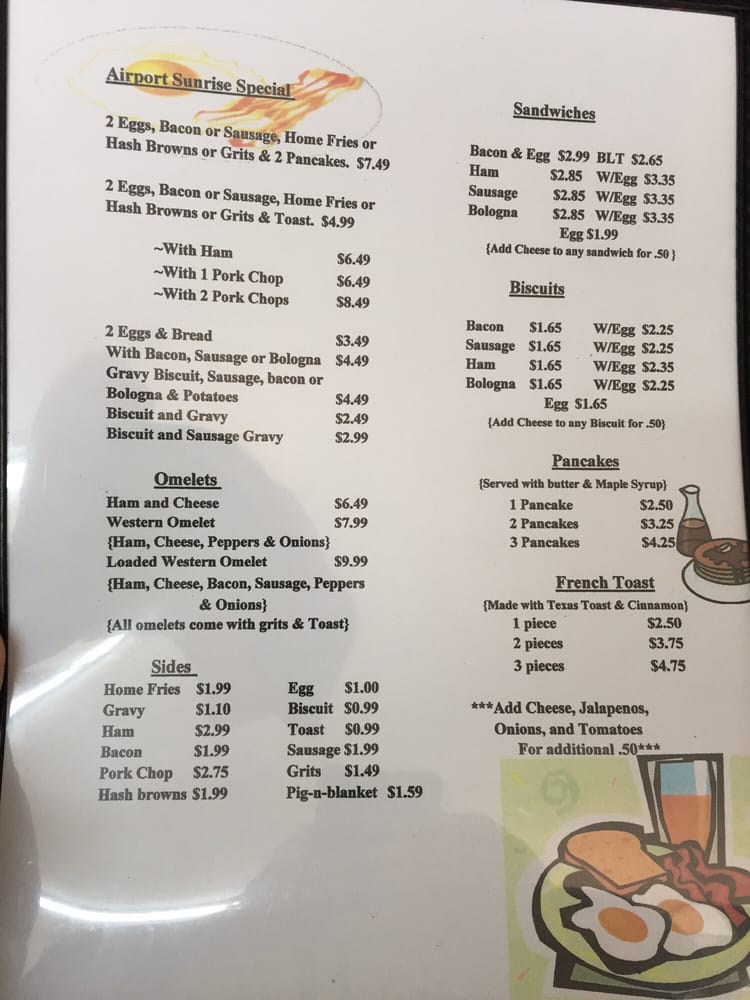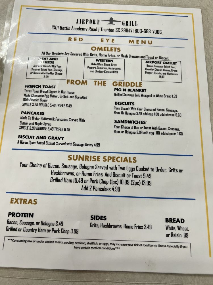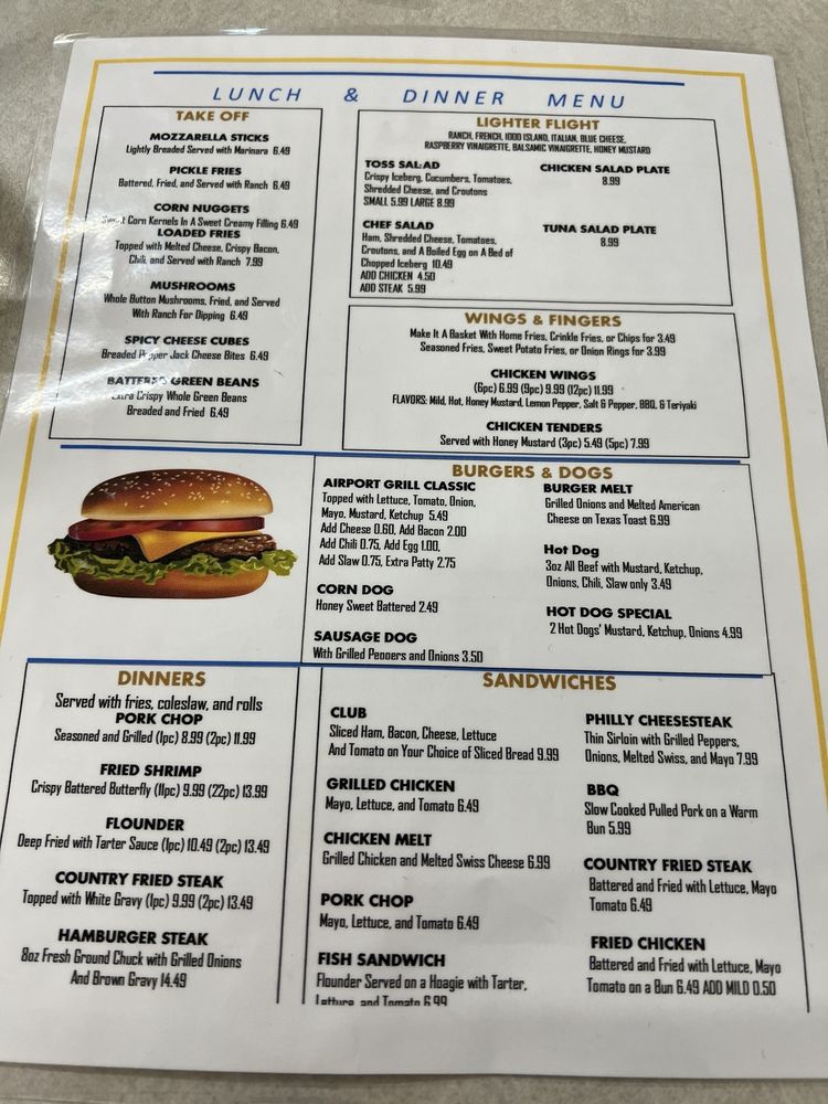 Introducing Airport Grill, a beloved American restaurant in Trenton, SC. Known for its hometown diner feel and made-to-order dishes, this family-owned gem offers a variety of breakfast options, from the hearty Airport Sunrise Special to delicious omelets like the Western Omelet. Customers rave about the juicy burgers, seasoned fries, and standout red velvet cake. With friendly service and affordable prices, Airport Grill is a must-visit for those looking for classic American cuisine in a cozy setting. Don't miss out on the crispy home fries, buttery biscuits, and meat-filled omelets. Experience the local charm and fast service that keeps patrons coming back for more at Airport Grill.